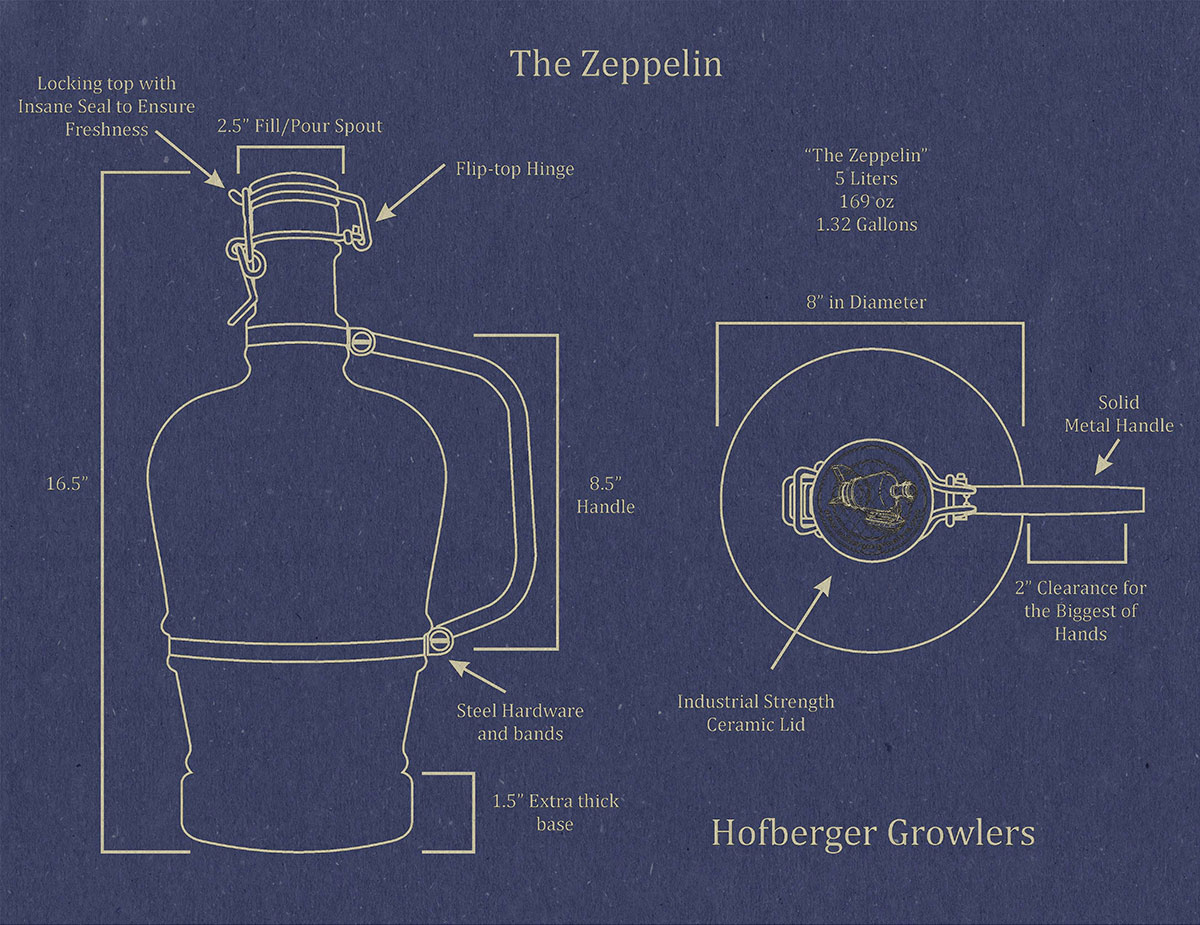 The “Zeppelin” is 5 liters (169 oz), that is nearly three times the size of the traditional growler. It is the perfect growler to share with a group or a great way to have over a gallon of your favorite craft beer at home. Our “Zeppelin” Growlers are made with the finest European glass that is nearly ¼” thick and will allow your treasure to remain cold for a long period of time. The solid metal handle, swing top ceramic lid and air tight gasket are of the highest quality that will ensure freshness and durability.
